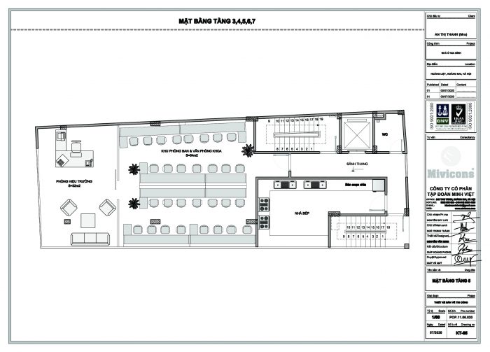 Từ tầng 3 đến tầng 7 có cấu trúc không gian đồng nhất, tận dụng tối đa diện tích cho nhu cầu của chủ đầu tư. Trong đó, tầng 4 có một vị trí nhà bếp riêng phục vụ những bữa cơm đảm bảo dinh dưỡng cho sức khỏe của cán bộ trong toàn khối văn phòng.